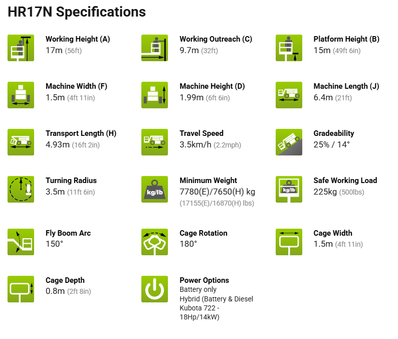 | Drivkraft | Nifty HR17N er en special lift der køre på EL. Liften er kun 150cm bred. Den er derfor meget velegnet indendørs og trange steder. Endvidere er liften monteret med “Non Marking” afsmitningsfri dæk. |